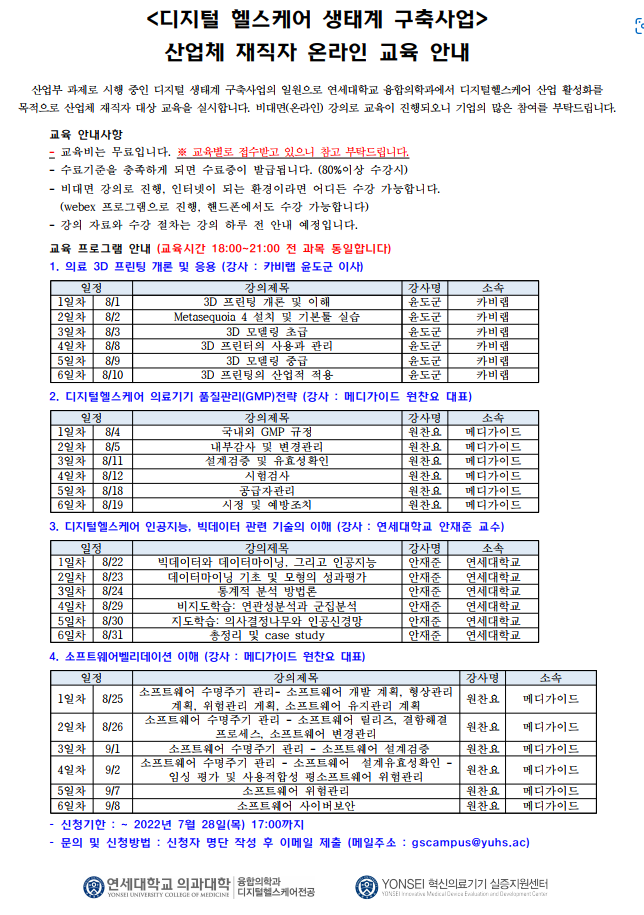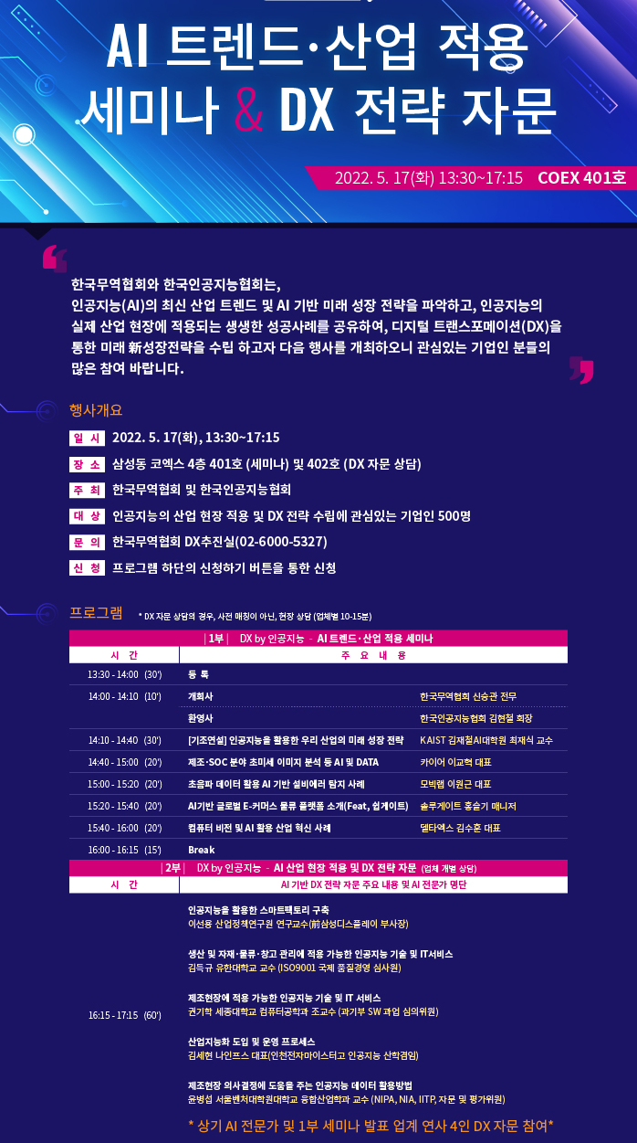 [무역협회] DX by 인공지능, Ai 트렌드 세미나 및 DX전략 자문 [무역협회] DX by 인공지능, Ai 트렌드·산업적용 세미나 및 DX 전략 상담 ㅇ 일시 : 22. 5. 17(화) 14:00~17:15 ㅇ 장소 : 코엑스 4층 401호 (오프라인) ㅇ 비용 : 무료 ㅇ 주최 : 한국무역협회 및 한국인공지능협회 ㅇ 신청링크 : https://forms.gle/yyCpUCZPPdBBZVYj8 * 참석자별 개별 접수 필요 ㅇ (세미나) AI 트렌드 및 산업 적용 세미나(14:00~16:00) ㄴ인공지능을 활용한 우리 산업의 미래 성장 전략 * KAIST 김재철AI대학원 최재식 교수 ㄴ제조·SOC 분야 초미세 이미지 분석 등 AI 및 DATA * 카이어 이교혁 대표 ㄴ초음파 데이터 활용 AI 기반 설비..